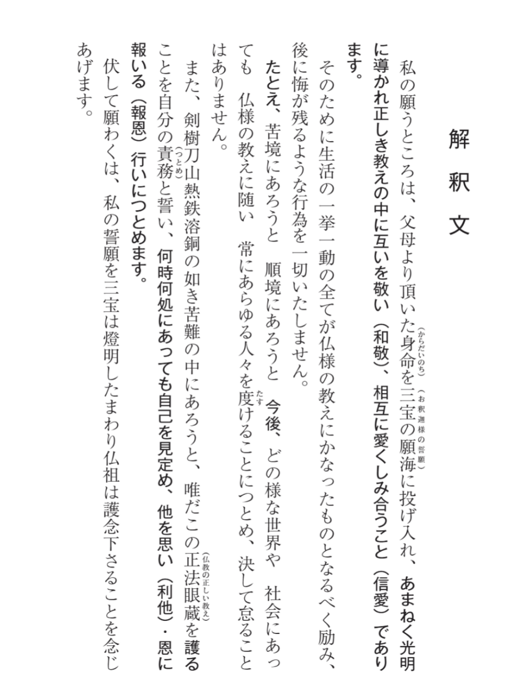 「報恩」神仏、天地、父母、衆生(社会)より受ける広大無辺の恩徳を思い、感謝報恩の生活を送る。