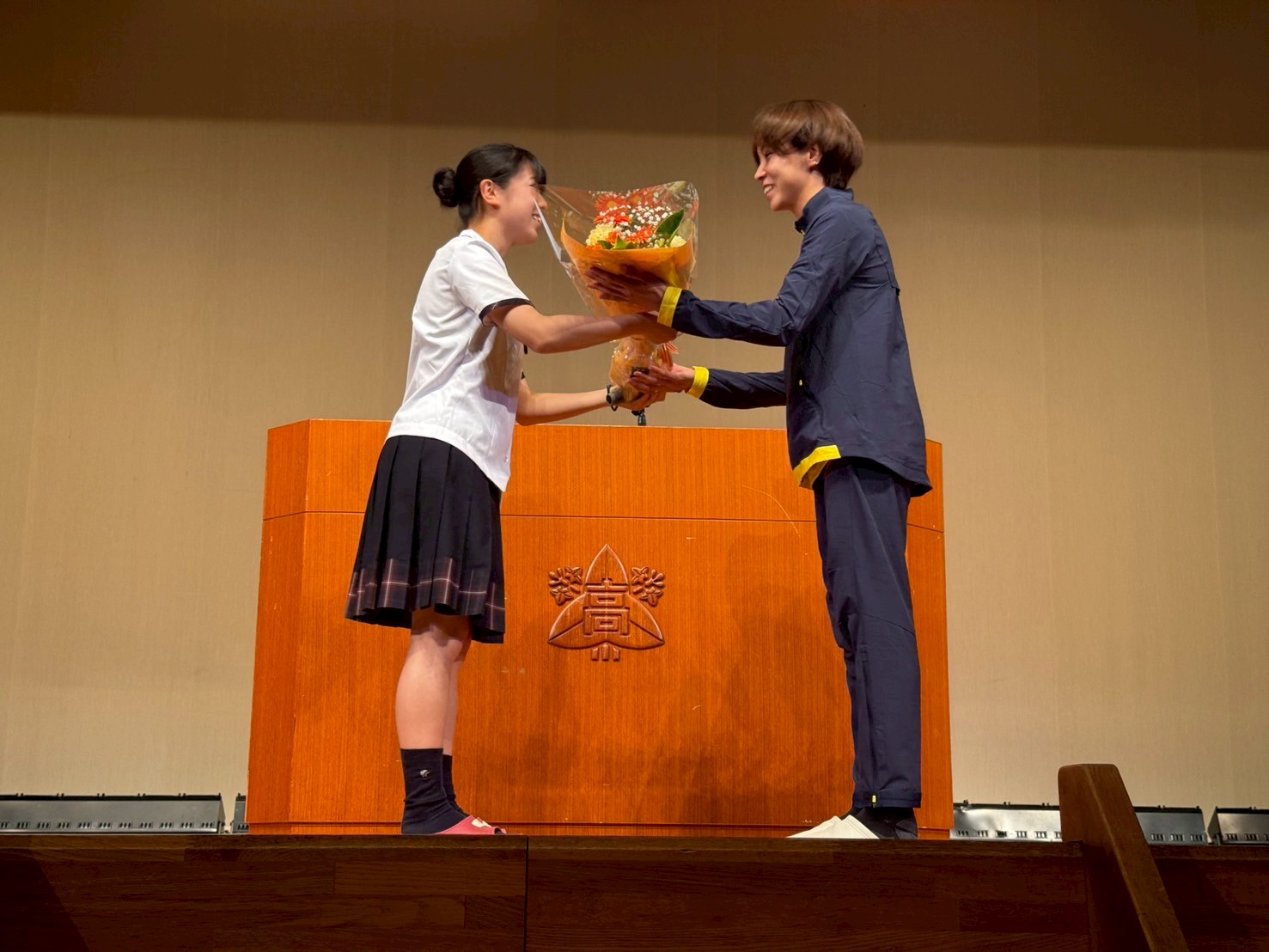 その後、女子駅伝部主将・藤田さんより、花束の贈呈が行われ、在校生を代表して感謝と敬意の気持ちが伝えられました。