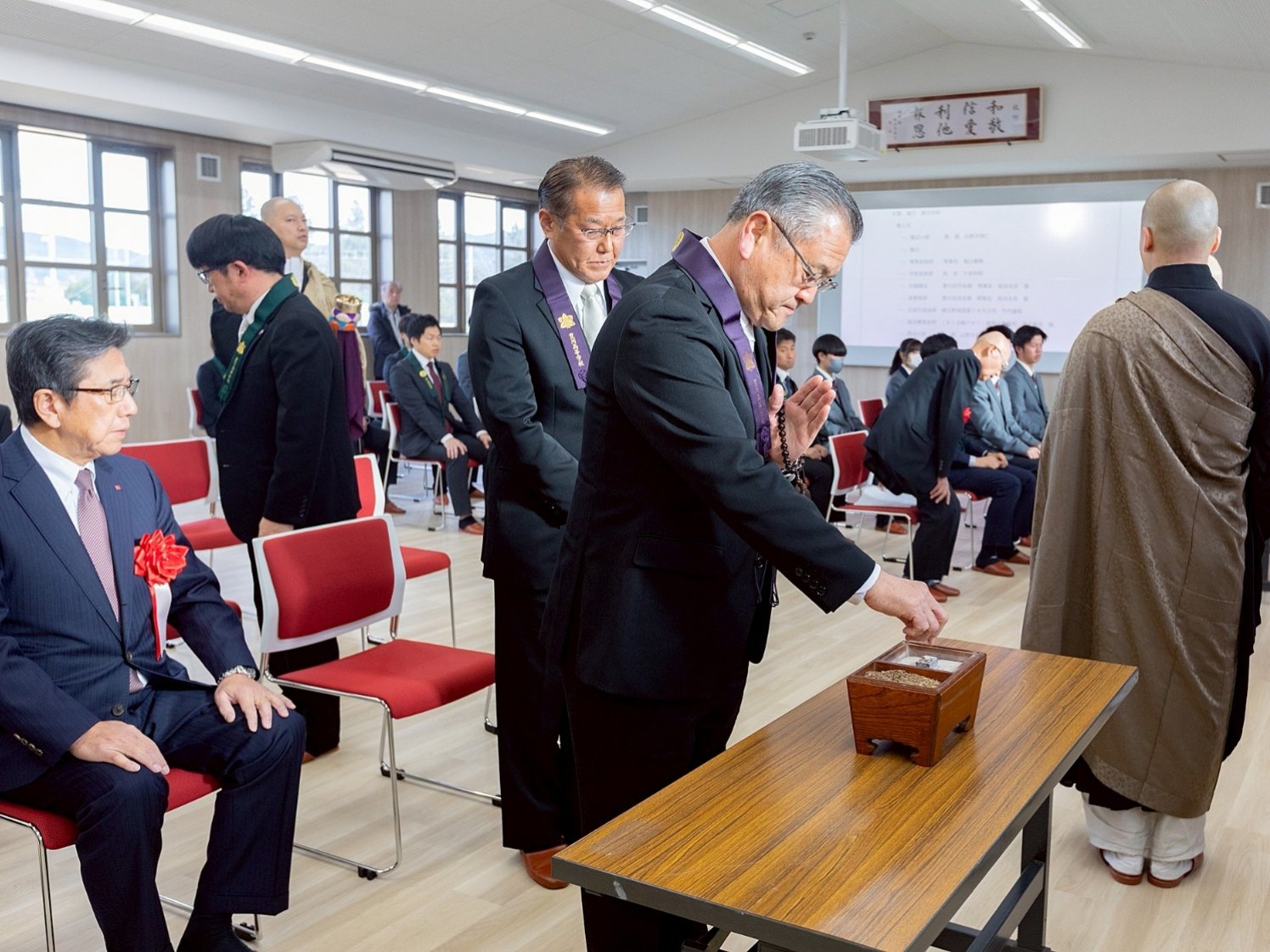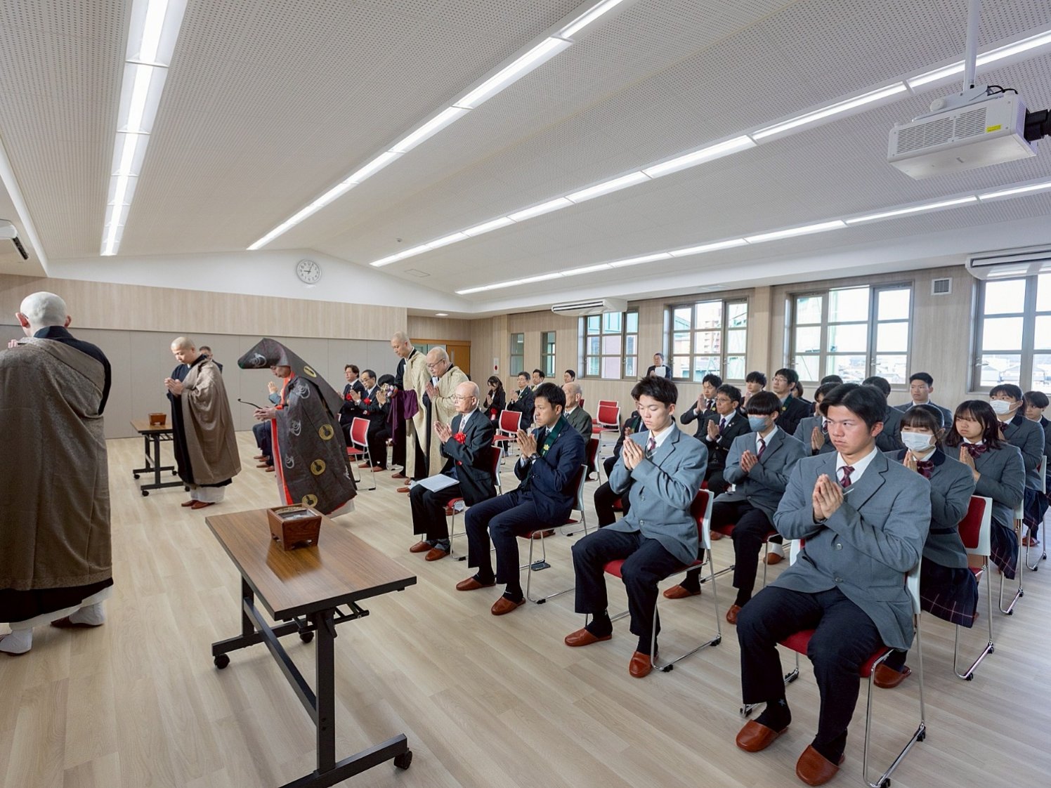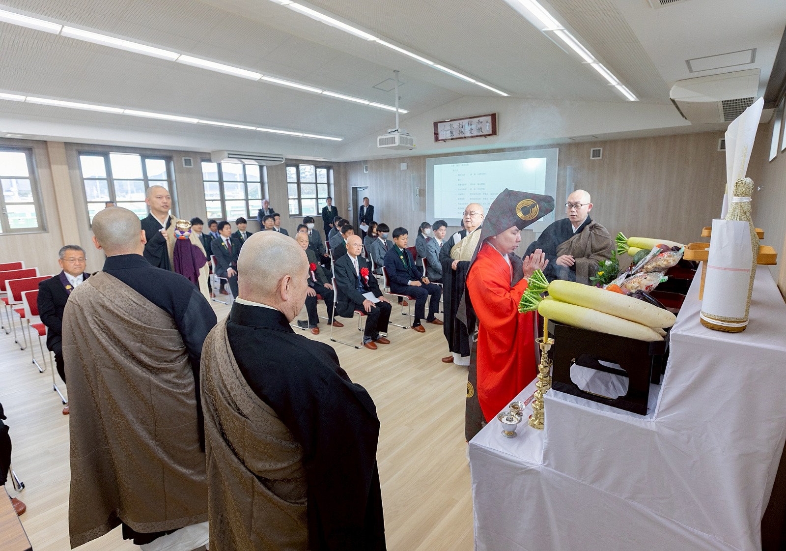 式は勤行から始まり、静謐な空気の中、導師を中心に厳かなお勤めが行われました。参列者一人ひとりが焼香し、躍進館が生徒の健やかな成長と学園のさらなる発展を支える場となることを祈念しました。会場全体が、これから始まる新たな物語に心を向ける、引き締まった時間となりました。