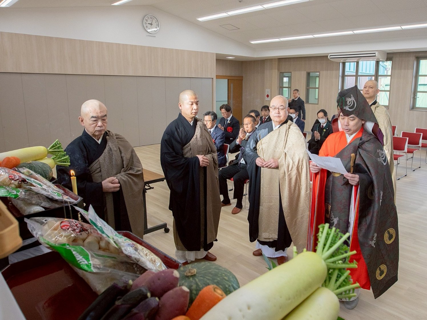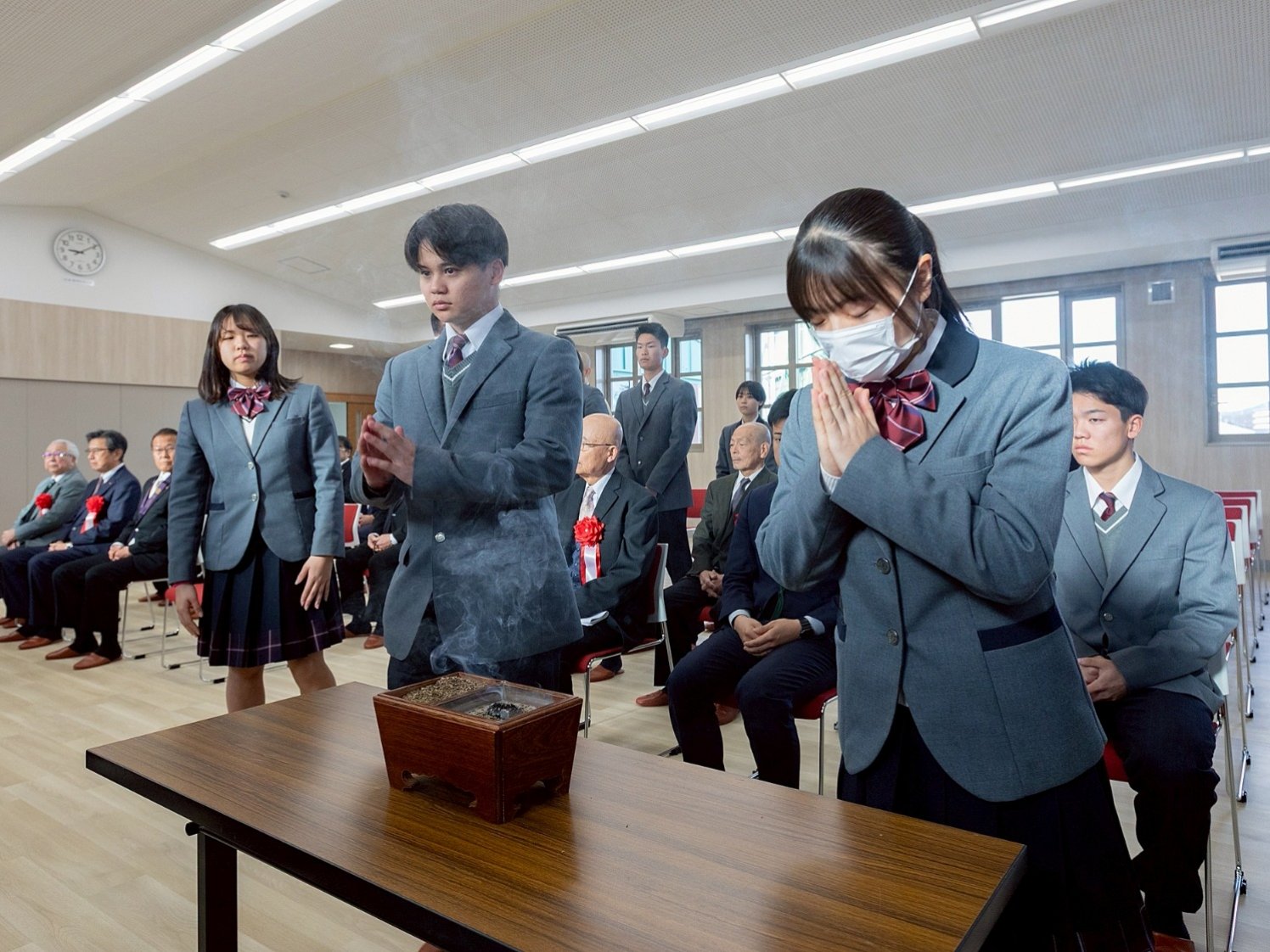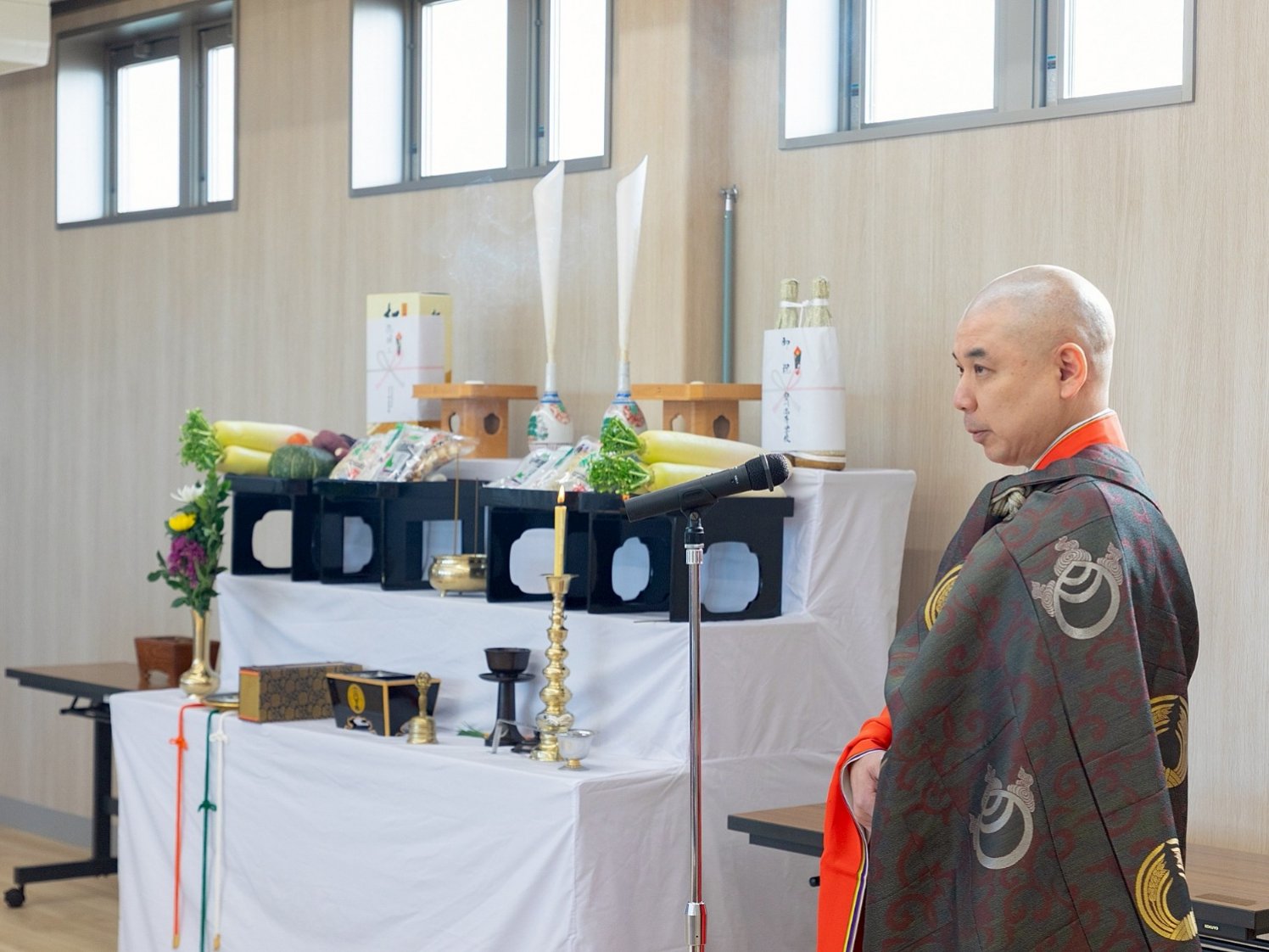 式は勤行から始まり、静謐な空気の中、導師を中心に厳かなお勤めが行われました。参列者一人ひとりが焼香し、躍進館が生徒の健やかな成長と学園のさらなる発展を支える場となることを祈念しました。会場全体が、これから始まる新たな物語に心を向ける、引き締まった時間となりました。