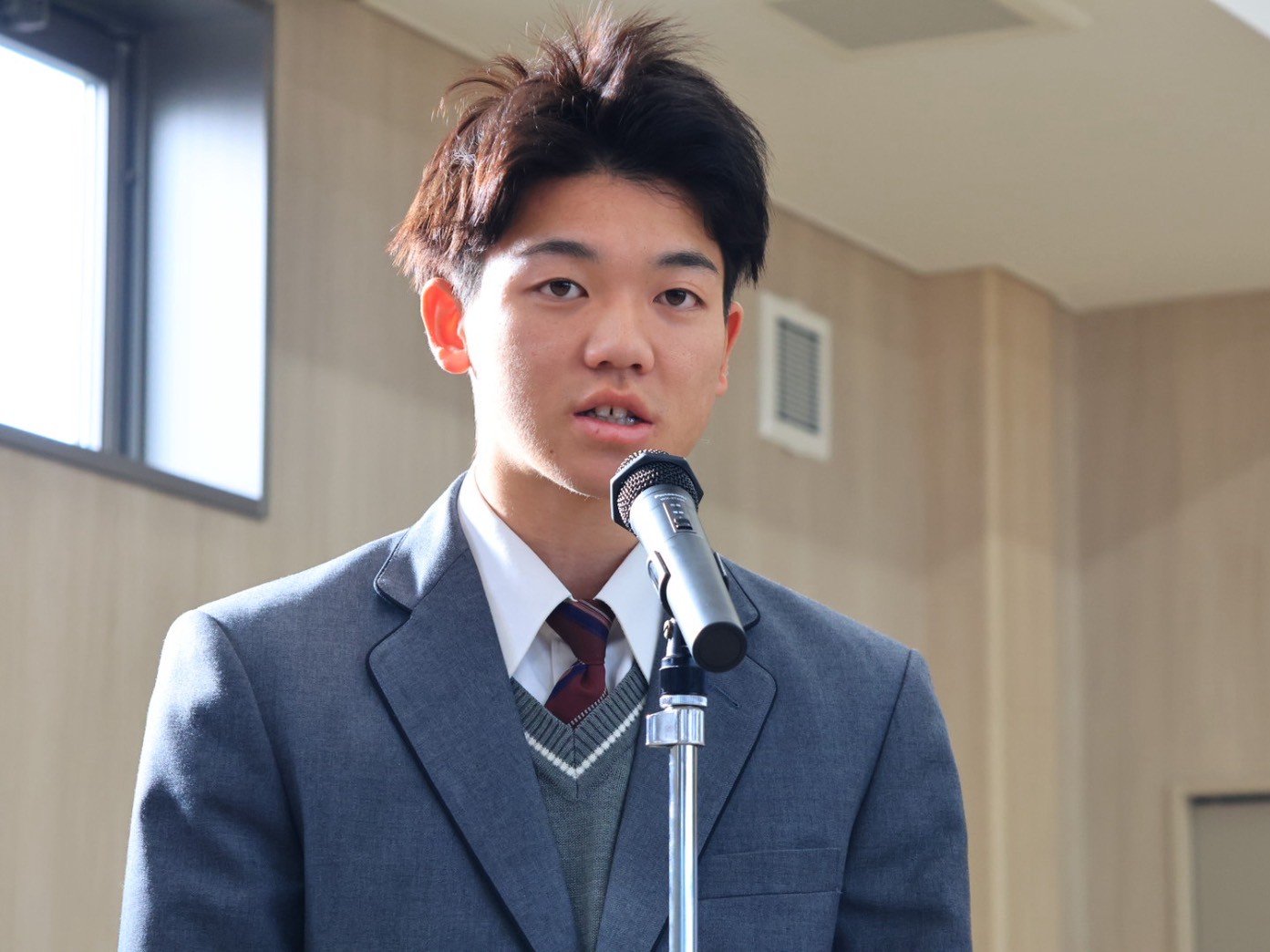 生徒代表挨拶では、硬式野球部第78代主将の竹内雄惺くんが登壇しました。