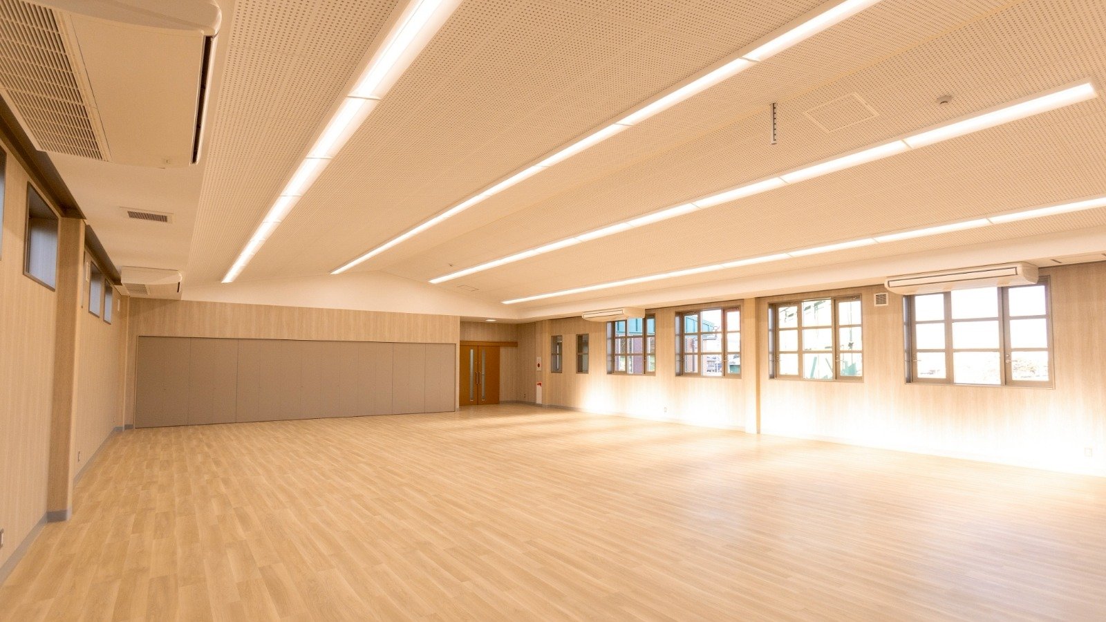 2階のレセプションホールは、軽運動が可能なクッション性のある床、十分な天井高、用途に応じて調整できる照明、後方まで鮮明に映し出す高性能プロジェクターを備え、多目的に活用できる空間となっています。