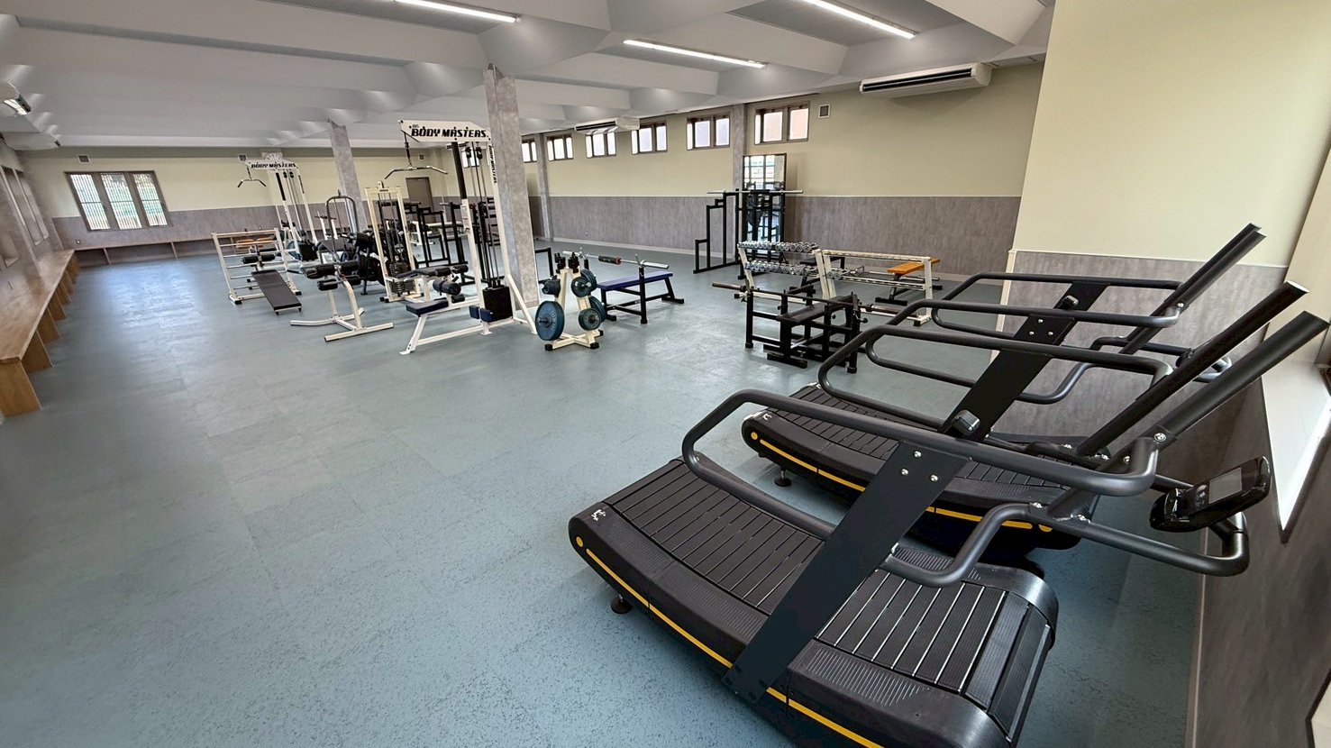 1階のトレーニングルームは、広々としたスペースに加え、目に光が入りにくい照明配置、周囲で休息が取れる壁面ベンチなど、集中と回復の両立を意識した設計が随所に施されています。