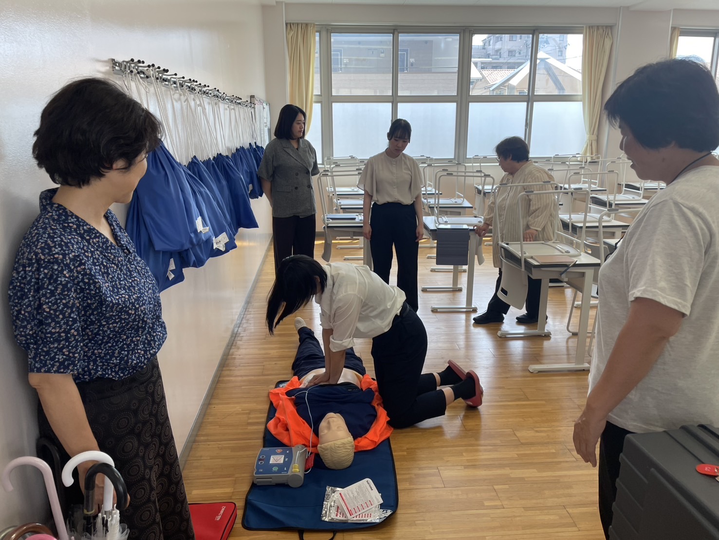 訓練では、実際に校内を移動しながら、心肺蘇生法(CPR)やAEDの使用をはじめ、チームでの連携を意識した迅速な対応をシミュレーション。緊急時を想定したリアルな訓練により、教職員一人ひとりが危機対応力を高める貴重な機会となりました。
