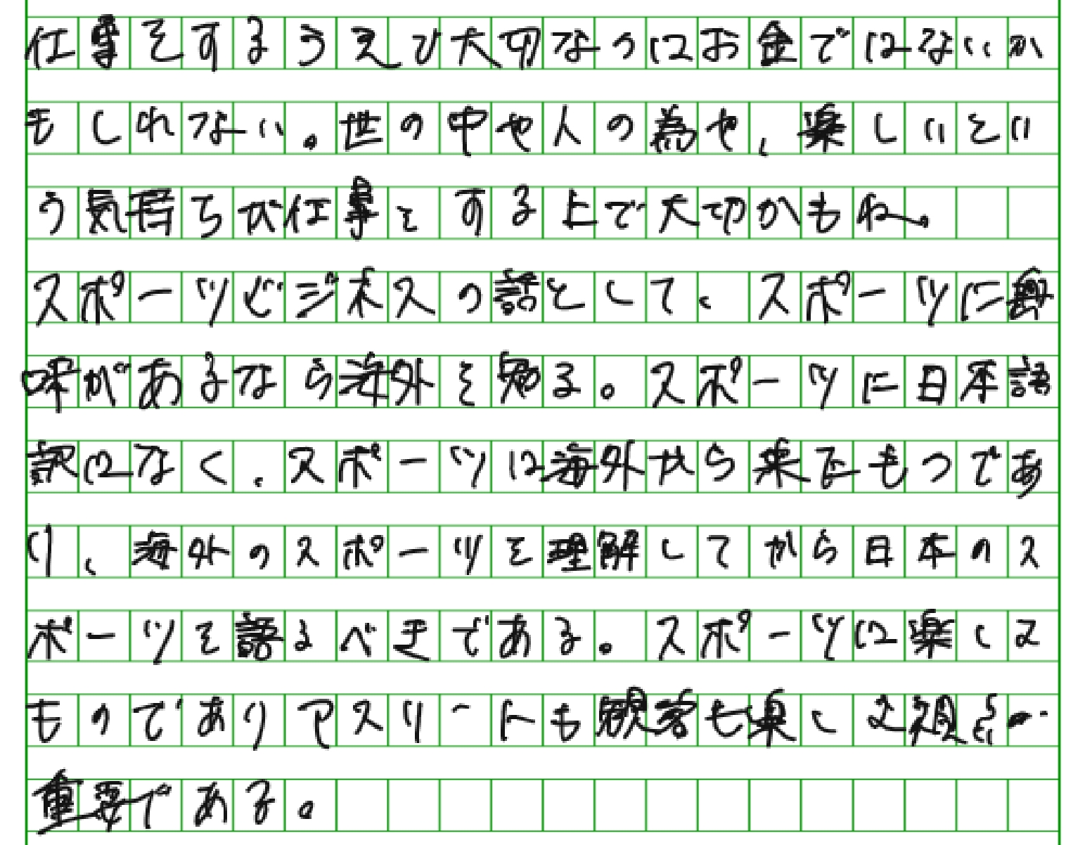 また、スポーツビジネスの話では、チケットやグッズの販売、スポンサー企業、放映権の仕組みなど、サッカー日本代表やDAZN、KIRINといった具体的な例を通じて、「スポーツも一つの経営である」ということを学びました。普段何気なく触れているスポーツの裏側に、たくさんのビジネスや工夫があることを知り、スポーツの見方が変わったように感じました。