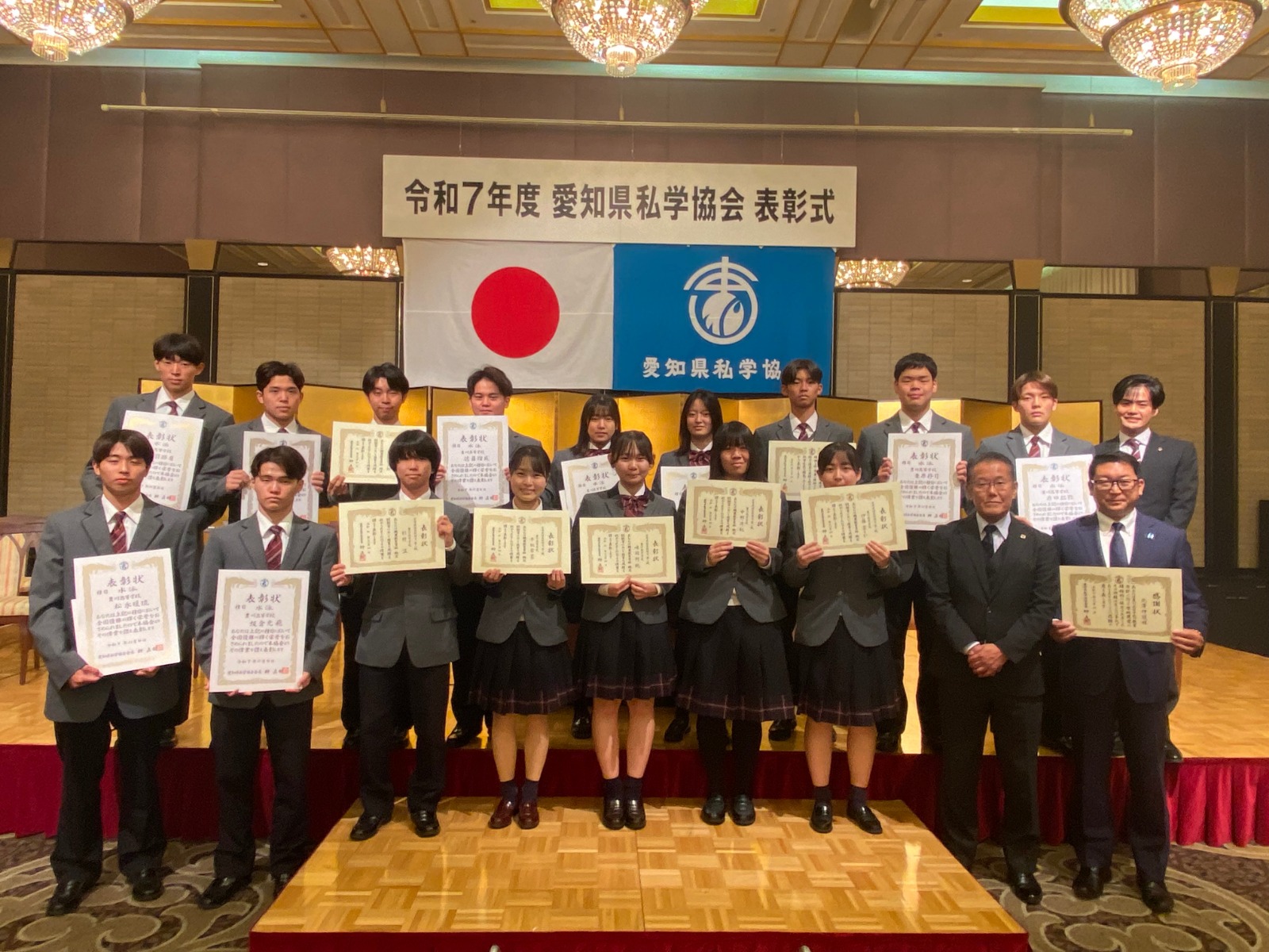 11月4日(火)、名古屋ガーデンパレスにて「愛知県私学表彰」が行われ、愛知県下56校から代表者が集まりました。本校からは、永年勤続・優良生徒・全国優勝・英検準1級合格者・感謝状の各部門で、総勢32名が表彰されました。