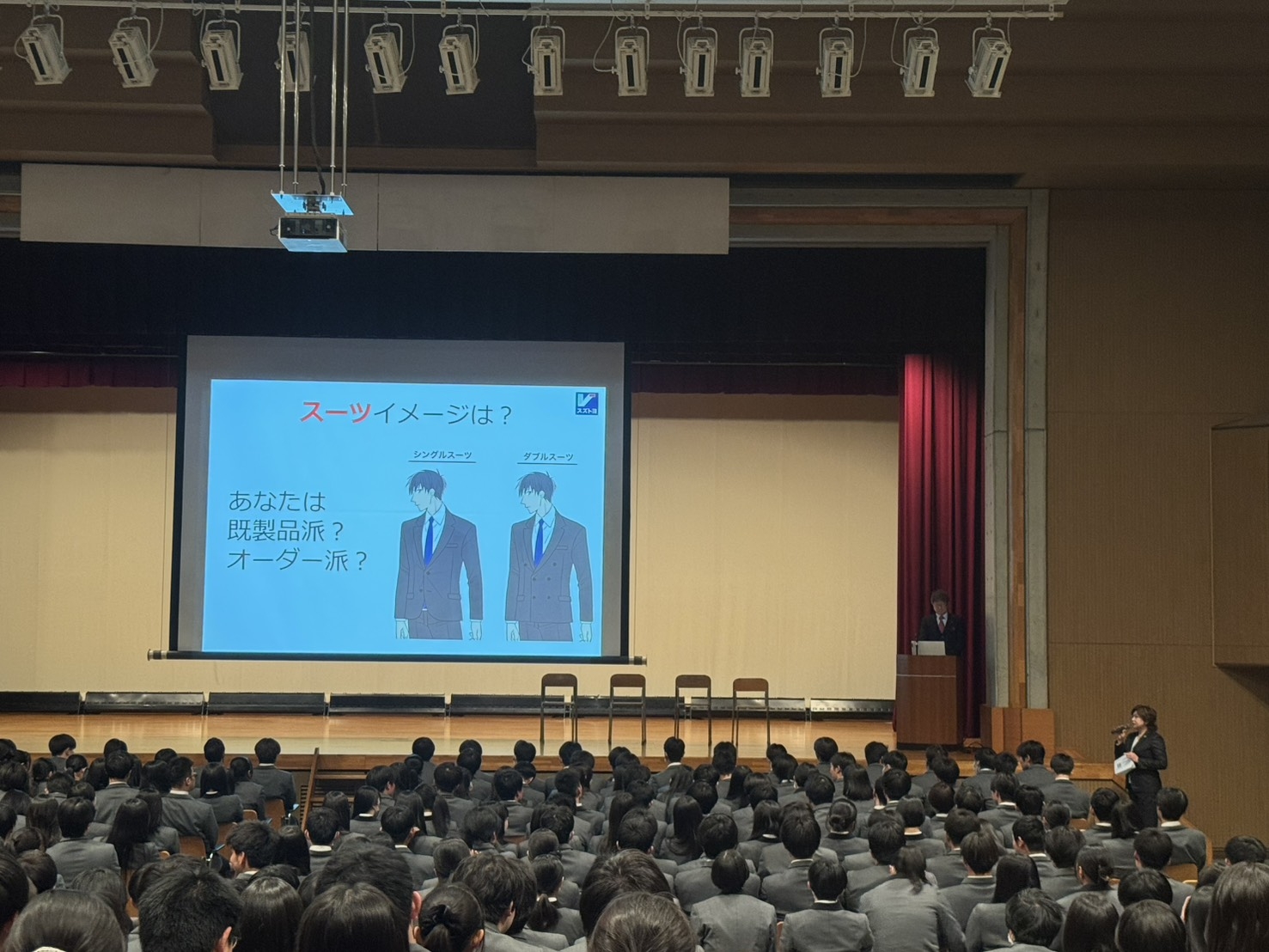 「身だしなみ」と「おしゃれ」の違い、体格や立ち姿に合わせたスーツ選びなど、実例を交えながら分かりやすく示していただきました。見た目が整うことで生まれる自信、そして相手に与える印象の変化に、生徒たちは真剣なまなざしを向けていました。
