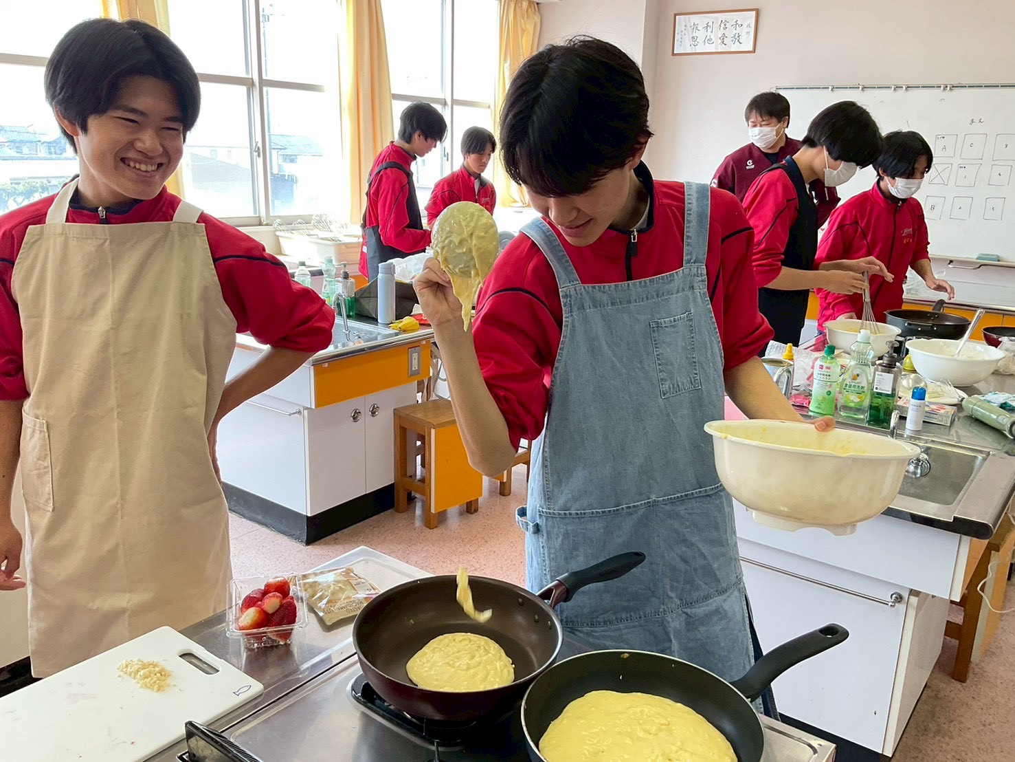 王道のホットケーキを追求する班や、おかず系に挑戦する班、テーマを持って独創的なアレンジを加える班など、個性あふれる作品が次々と完成しました。普段は部活動に打ち込み、料理をする機会がほとんどないという生徒も、悪戦苦闘しながら試行錯誤を重ね、最後には見事な一皿を仕上げていました。その姿には思わず感動する場面もありました。