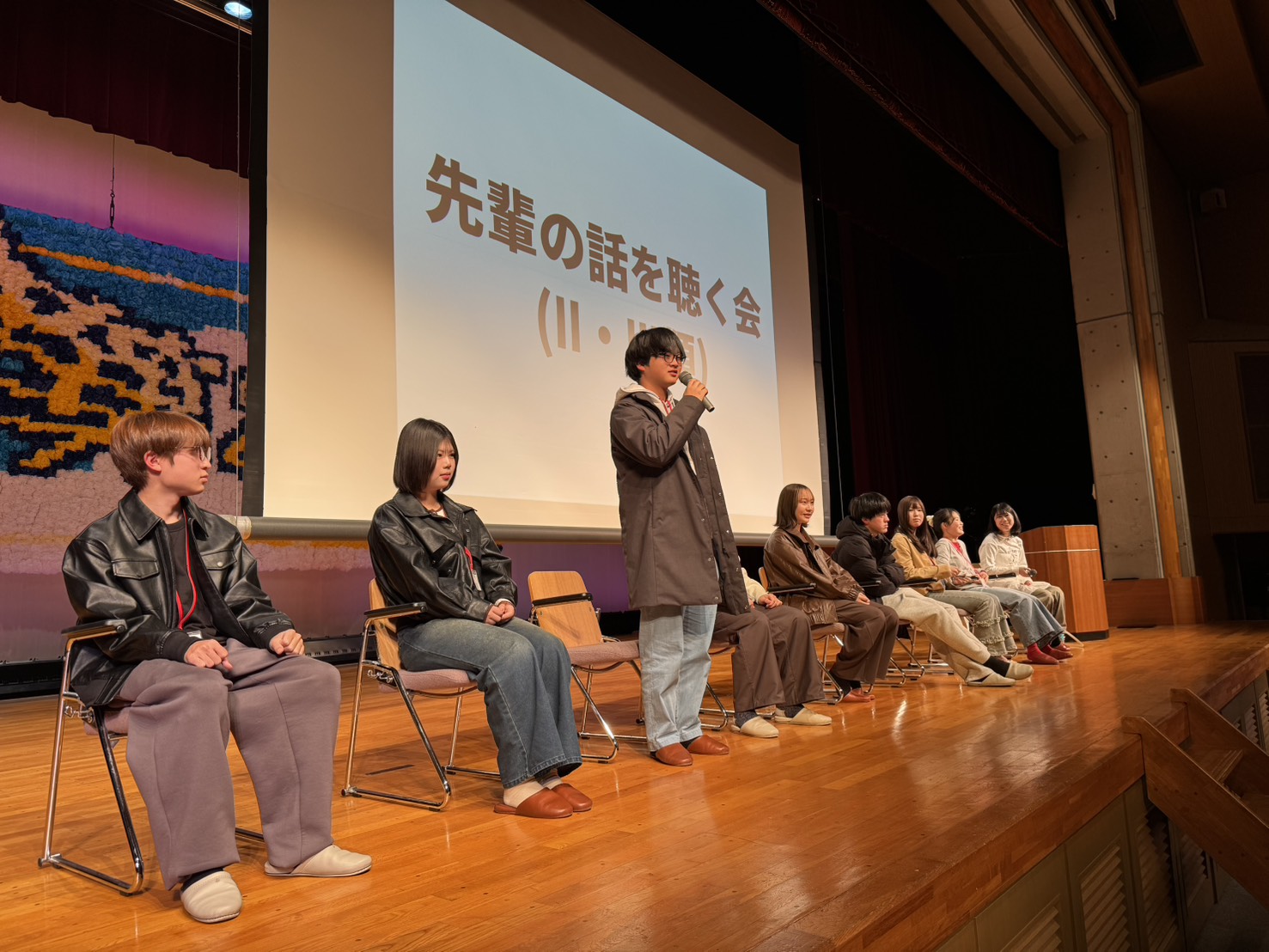 今年度は9名の卒業生が登壇しました。総合型選抜、学校推薦型選抜、一般選抜と、さまざまな入試形態で大学合格を果たした先輩たちが、それぞれの経験をもとに受験までの過程や高校生活で大切にしてきたことを後輩たちに伝えました。