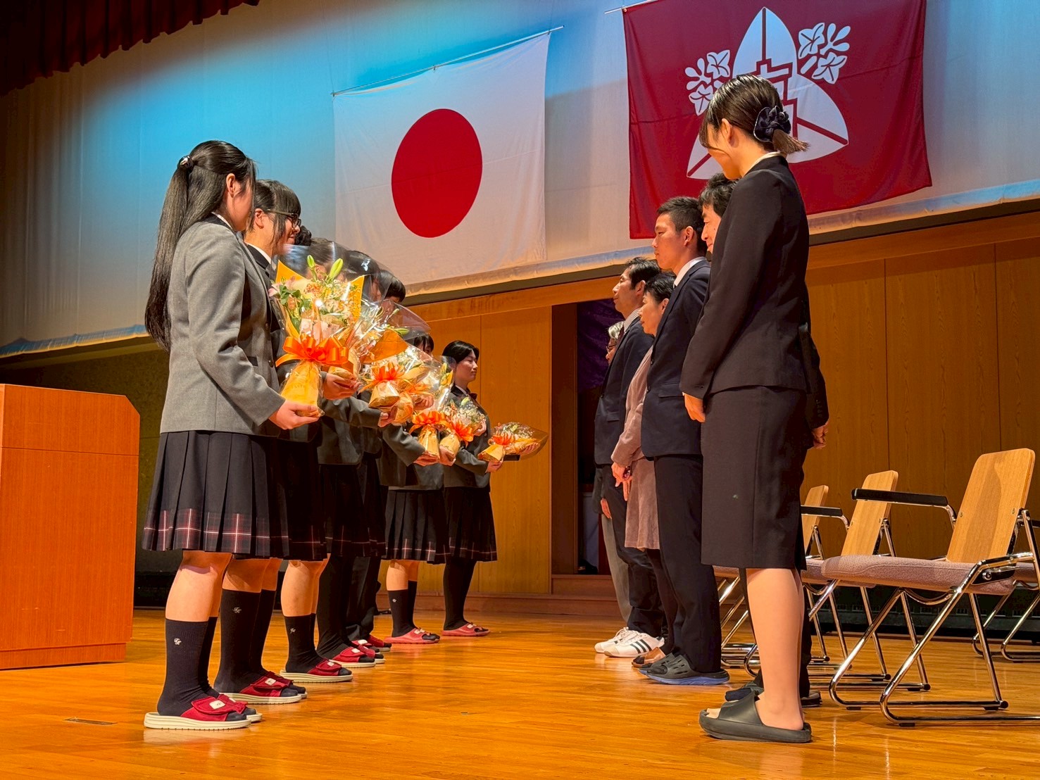 離任式の最後には、壇上にて生徒から花束が贈呈されました。感謝の気持ちを込めて手渡されるその瞬間には、これまでの思い出や絆が重なり、会場全体が温かな空気に包まれました。