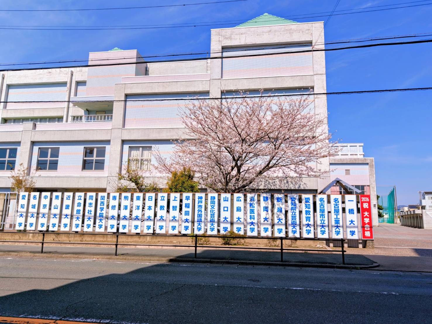 その桜のもとには、2026年度の大学合格一覧が掲示されています。