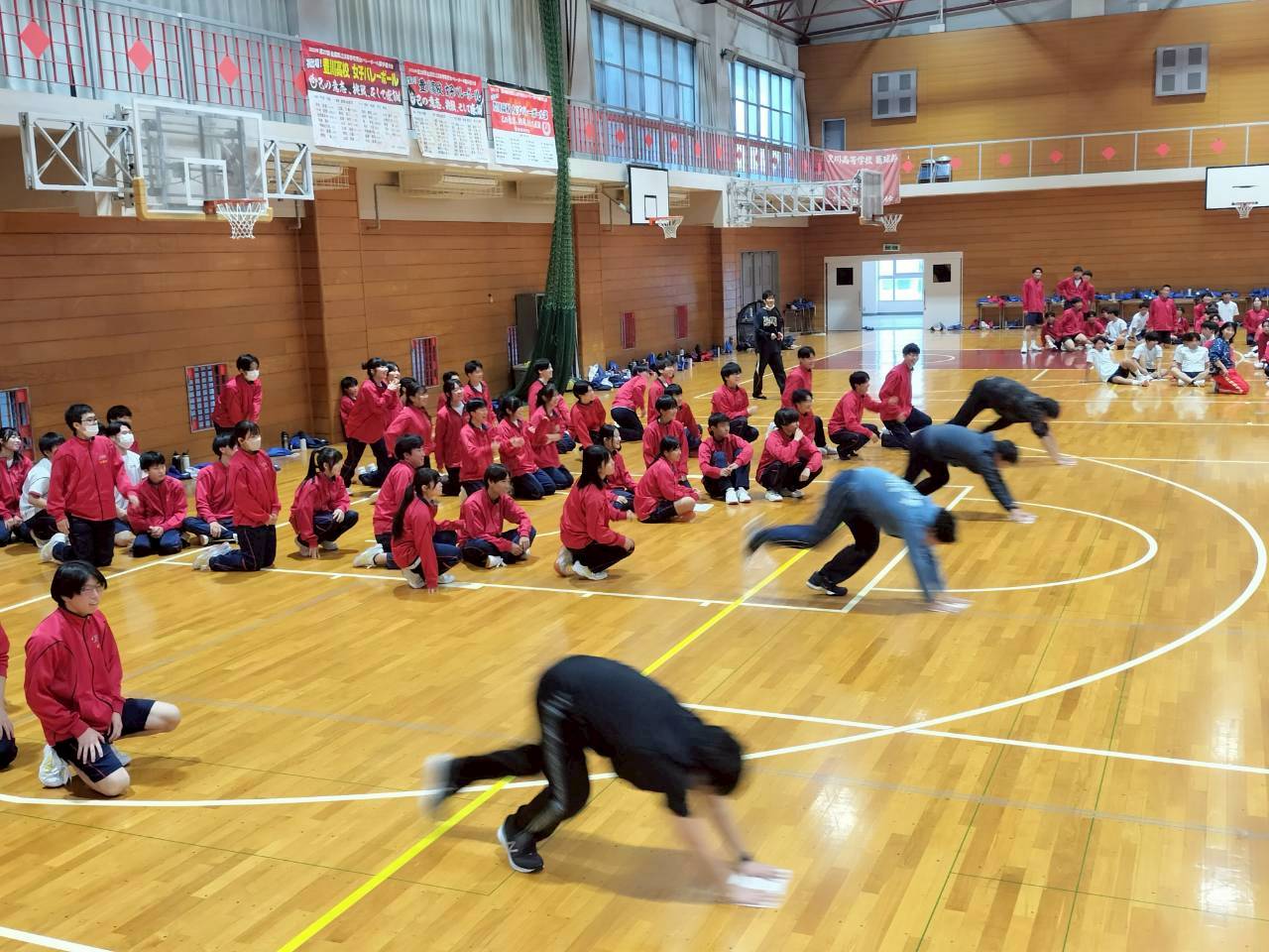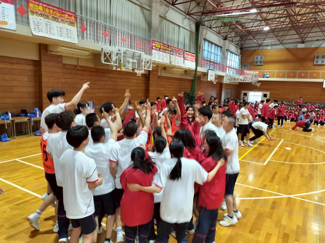 1人ずつバレーボールコートを駆け抜け、40人で20往復をつなぐタイムレース。スタートの合図とともに体育館中に歓声が響き渡り、担任の先生も加わって全力で走り抜けました。懸命に前へ進む生徒たちの姿は、会場にいる全員へ大きな活力を届けていました。