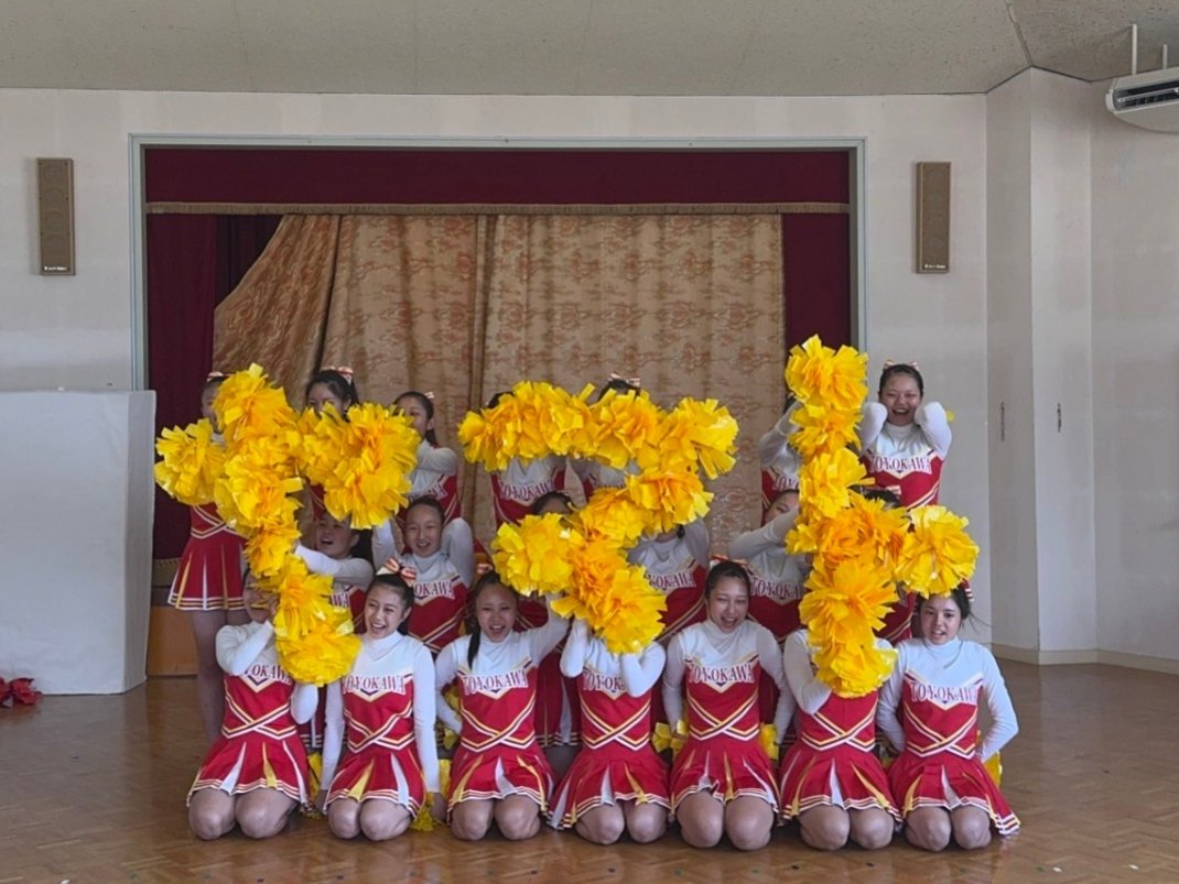 続いて、チアリーディング部による元気いっぱいの演技が披露され、会場は一気に明るく華やかな雰囲気に包まれました。その後は、園児の皆さんと一緒に「エビカニクス」を楽しく踊り、スタンツ体験(チア体験)も実施。子どもたちの弾けるような笑顔と歓声に、会場全体が笑顔で満ちあふれました。