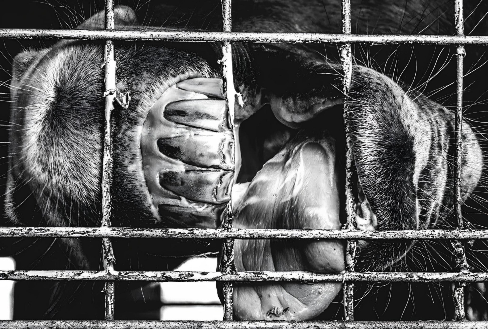 動物園で飼育されている馬を横位置で撮影。柵越しの視線から、見る側に多くの問いを投げかける印象的な作品です。