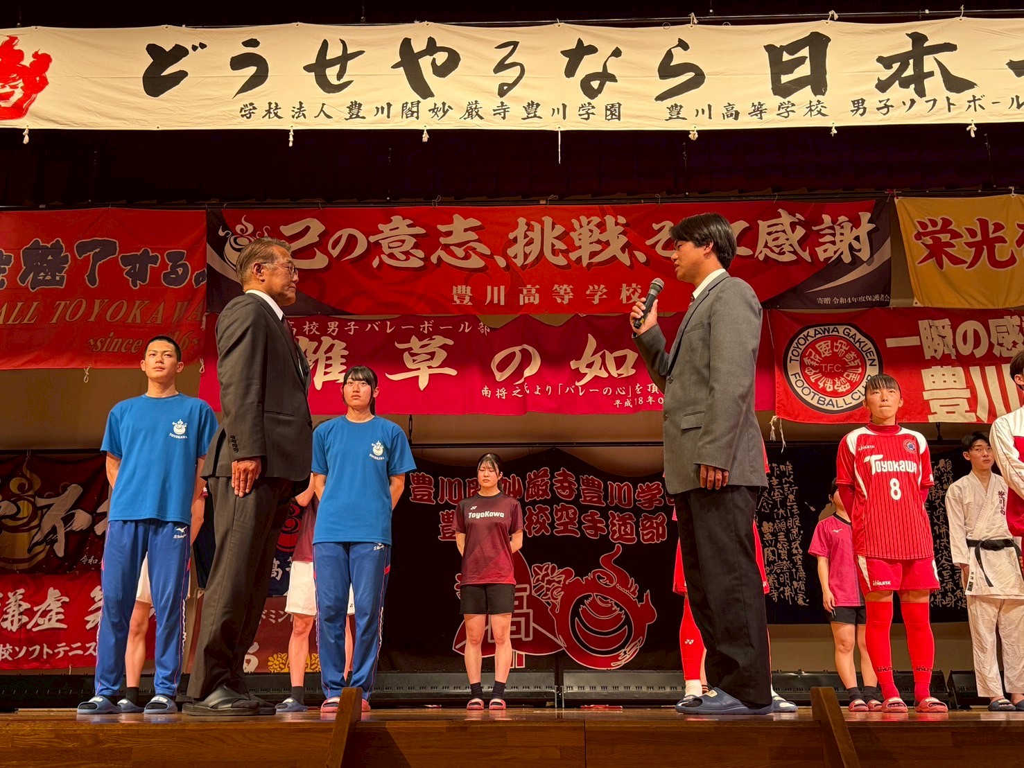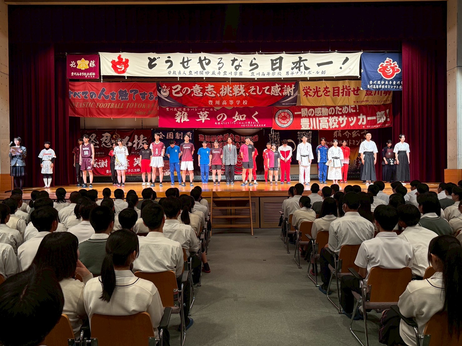 各部活動の主将が登壇し、それぞれの目標と決意を力強く発表。
